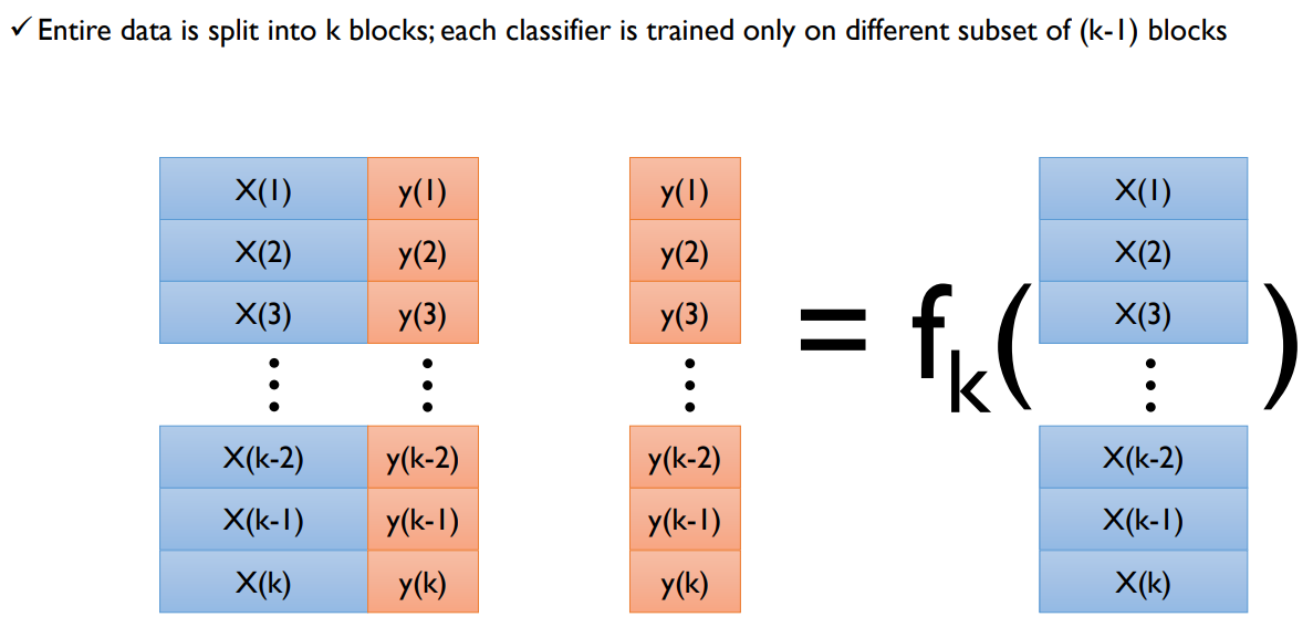 - 데이터를 k개의 fold로 나눈뒤 k개의 개별적인 모델을 각각 (k-1)개의 fold로 학습시킨다.