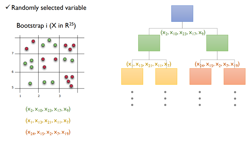 - 오른쪽은 recursive partitioning을 표현한 것인데. 매 split point마다 random하게 선택된 변수들만 가지고 partitioning을 수행한다.