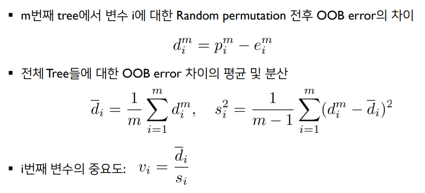 - 변수 $x_i$의 데이터를 섞은(permutation) 뒤에 OOB error $p_i$를 계산한다.