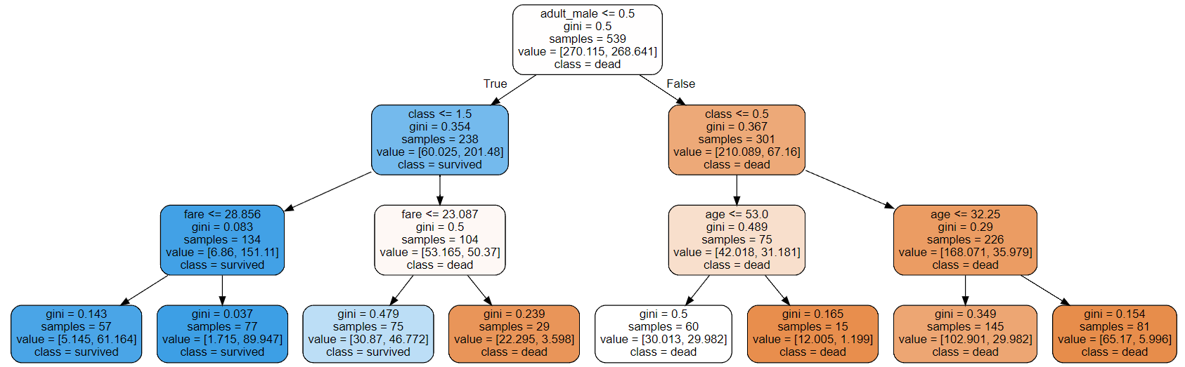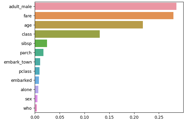- 자식 노드로 분기할 때 feature importance 값이 큰 adult male, class, fare, age를 기준으로만 분기한 것을 확인할 수 있다.
