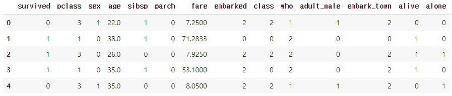 seaborn을 통해 titanic 데이터를 로드하고 간단한 전처리를 수행한다.