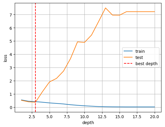 이를 train_loss와 test_loss를 plot해보면 depth가 3인 경우가 가장 좋은 모델이라고 볼 수 있다.