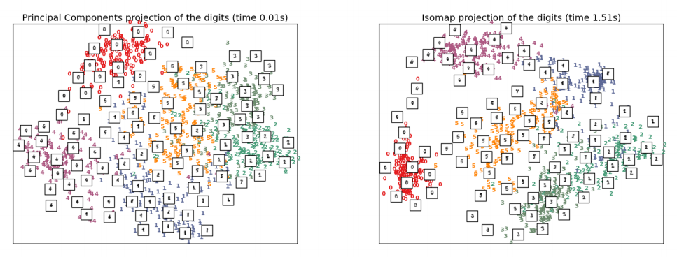또한 항상 그런 것은 아니지만 intrinsic dimension은 original dimension보다 상대적으로 낮을 때가 있다. 예를 들어, MNIST 데이터셋을 PCA와 ISOMAP을 사용해 2차원으로 축소한 뒤 시각화를 해보면 다음과 같다.