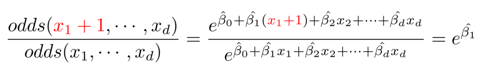 다른 변수의 값은 고정되어 있고 $x_1$만 1만큼 증가했다고 가정해보자. 이 때 odds ratio는 다음과 같다.