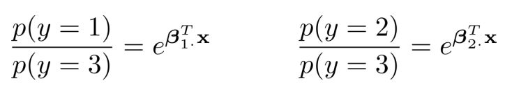 예를 들어 3개의 클래스가 있는 경우, 기준 클래스를 3으로 잡고 다음과 같이 2가지 회귀 모델에 대한 coefficients를 추정한다.