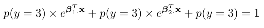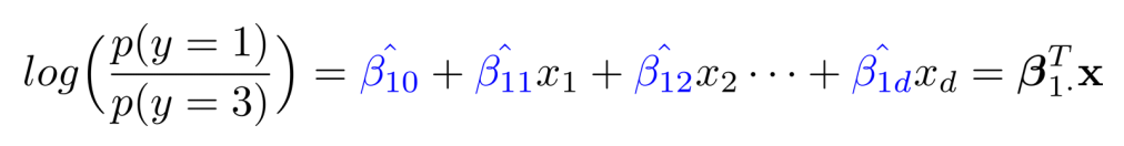 예를 들어 3개의 클래스가 있는 경우, 기준 클래스를 3으로 잡고 다음과 같이 2가지 회귀 모델에 대한 coefficients를 추정한다.