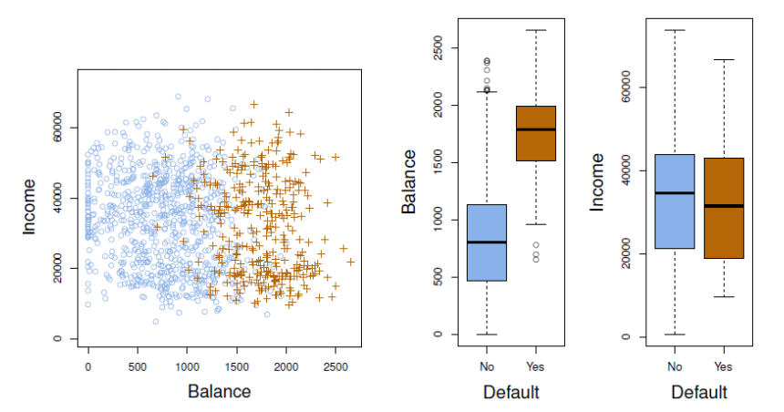 - 2개의 변수 Income(수입)과 Balance(갚아야 할 잔액)만 가지고 왼쪽은 scatter plot, 오른쪽은 box plot을 수행한 것이다.