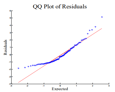 - 잔차들이 신뢰구간 (-1.96, 1.96)에서 빨간 색 선을 따를 때 정규분포를 따른다고 볼 수 있다.