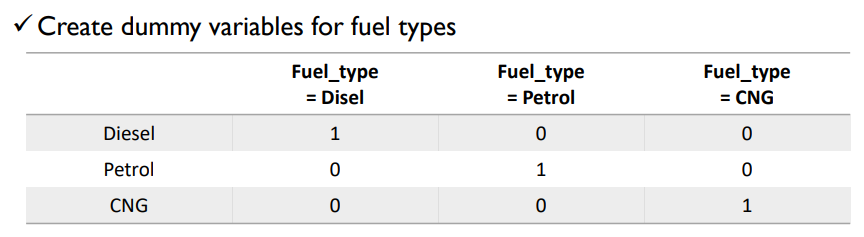- Fuel_Type간의 선형적인 관계가 없기 때문에 one hot encoding이 적절하다.