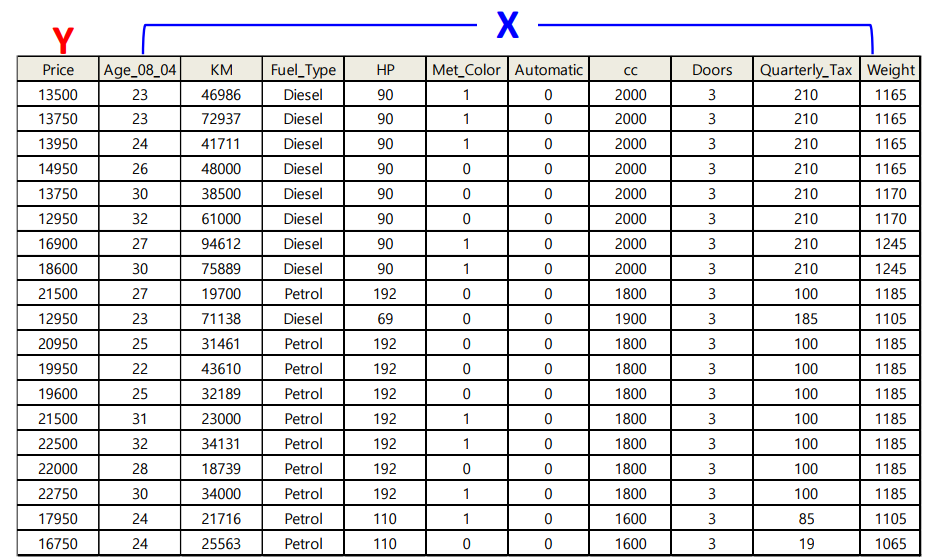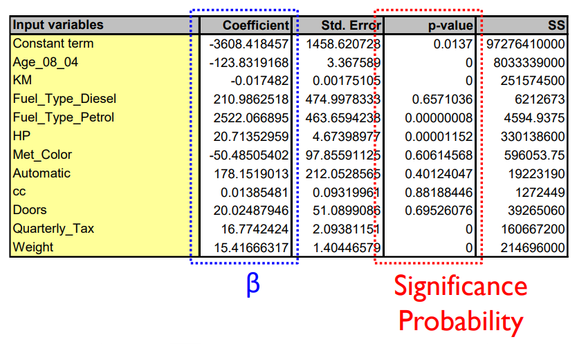 - 예를 들어 Age가 1만큼 증가하면 price는 123만큼 감소한다는 뜻이다.