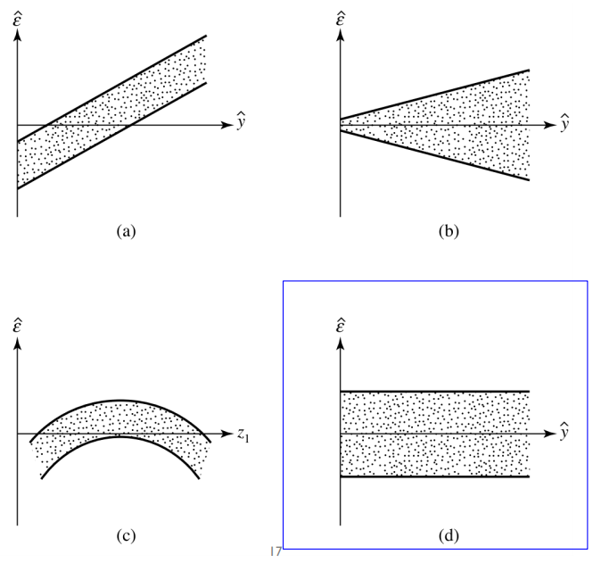 Y값에 따른 잔차를 plot 했을 때는 (d)의 경우처럼 일정해야 한다.