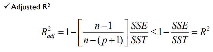 $R^2$의 단점이 예측 변수가 많아질 수록 단조 증가한다는 단점이 있는데 이를 보완하기 위해 Adjusted $R^2$를 사용하기도 한다.