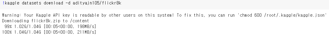 내 생각대로 데이터셋을 다운로드 받는데는 아무런 문제가 없지만 내 kaggle api 키가 소유그룹이나 다른 사용자에게도 read 권한이 그대로 남아있어서 그런 것 같다. 리눅스는 보안을 중요시 여기는 것 같다.
